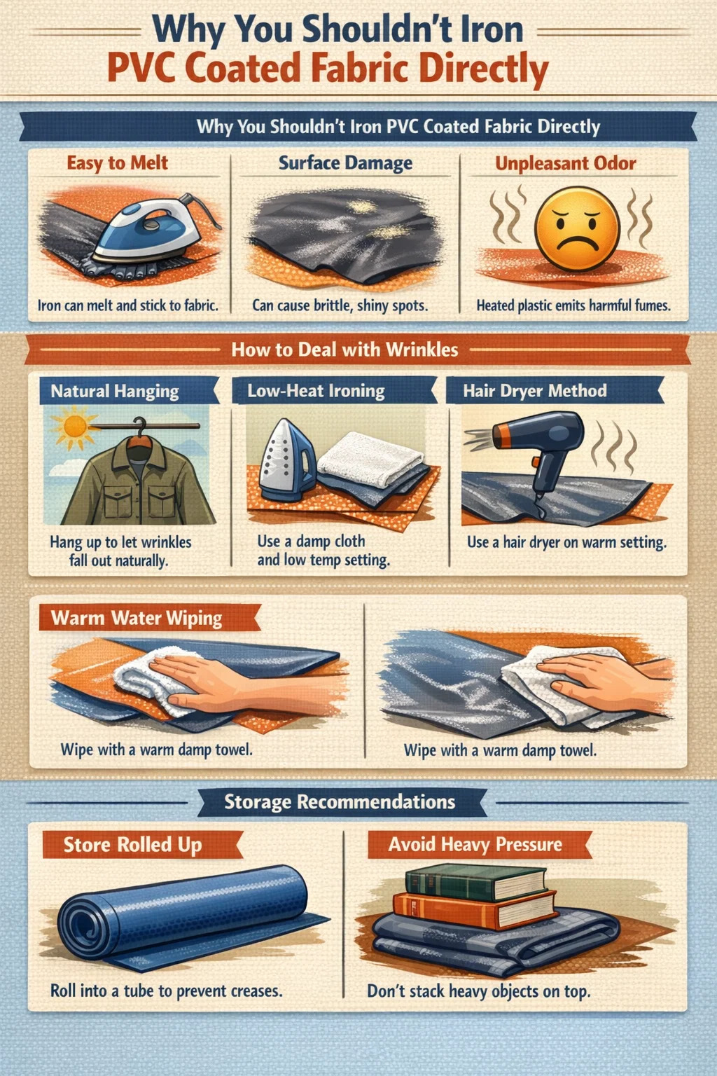Facile da sciogliere: l'alta temperatura del ferro ammorbidisce o addirittura scioglie rapidamente la plastica superficiale. Una volta sciolto, il Tessuto spalmato in PVC non solo si deformerà, ma si attaccherà anche alla piastra del ferro come colla, rovinando sia il capo che il ferro.
