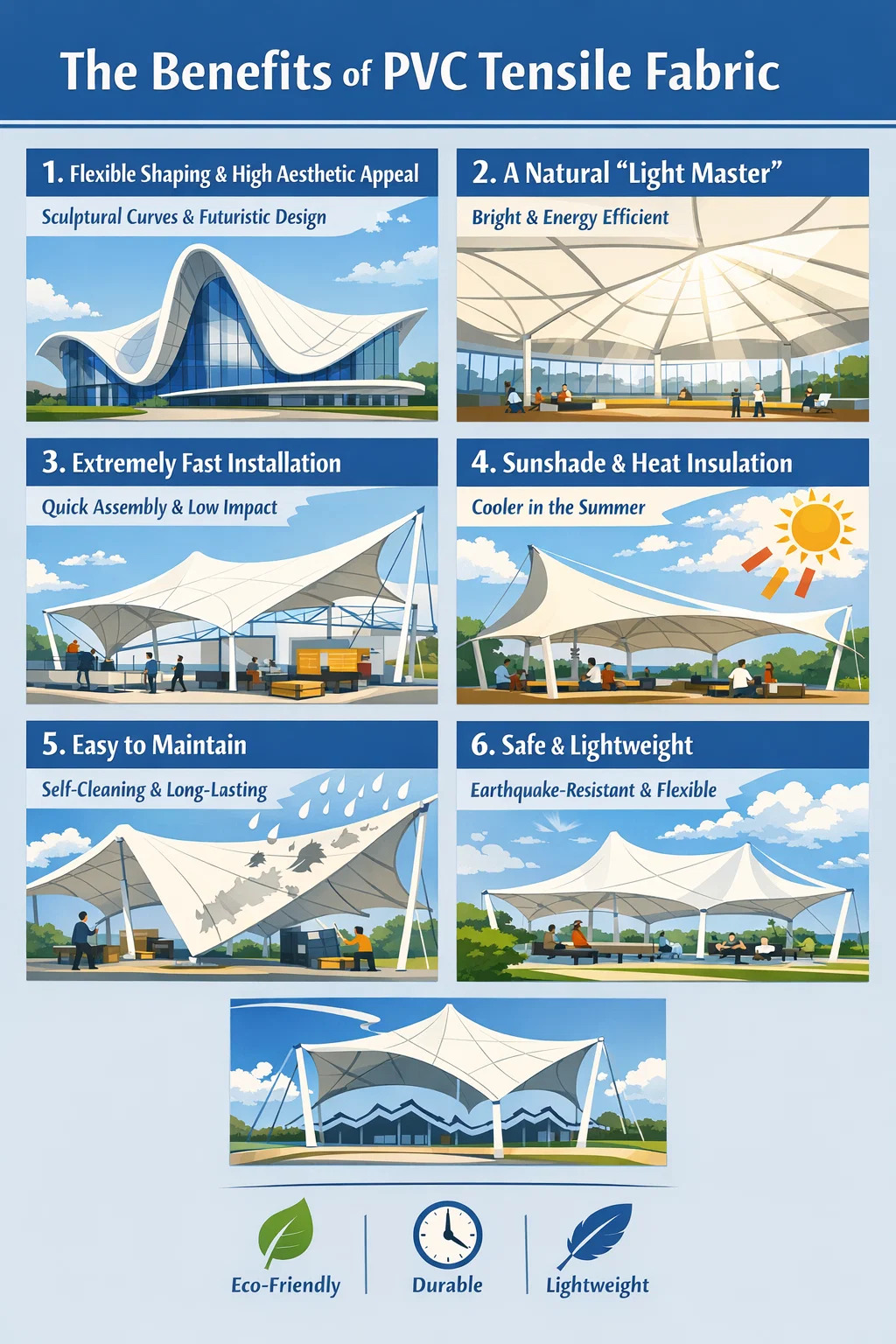 Parlando dei vantaggi di Tessuto di trazione in PVC , la sua popolarità nell'architettura moderna, in particolare negli stadi, nelle piazze all'aperto e nell'ombreggiatura del paesaggio, deriva dai suoi numerosi vantaggi unici rispetto ai materiali tradizionali.