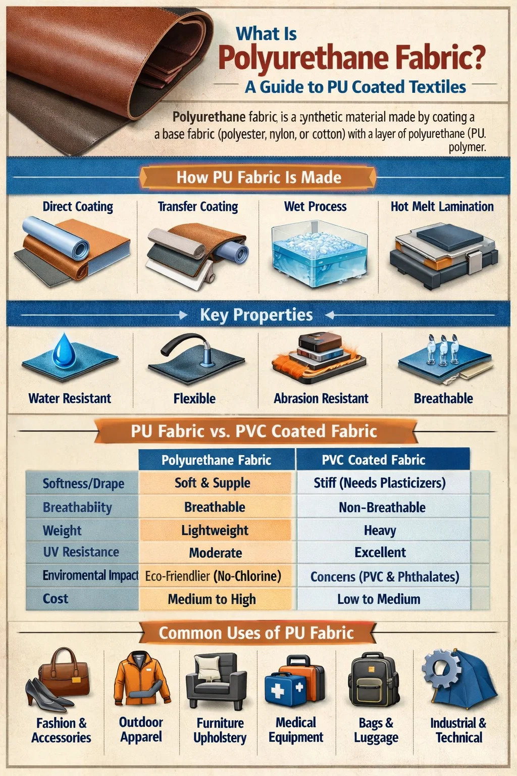 A differenza dei tessuti intrecciati o a maglia, il tessuto in poliuretano trae le sue caratteristiche distintive dal rivestimento in PU stesso, che può essere progettato per caratteristiche prestazionali specifiche: resistenza all'acqua, traspirabilità, morbidezza o rigidità. Il rivestimento in PU rappresenta tipicamente il 15–60% del peso totale del materiale , a seconda dell'uso finale previsto.