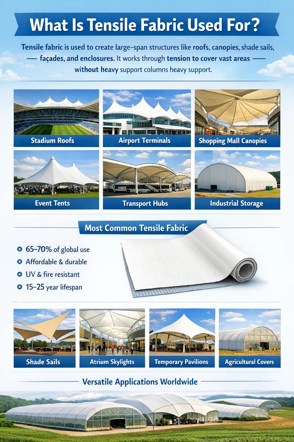 | Poliestere rivestito in PVC | Filato di poliestere | 15-25 anni | 15–45 USD | Eventi, pensiline, stadi, industriali |